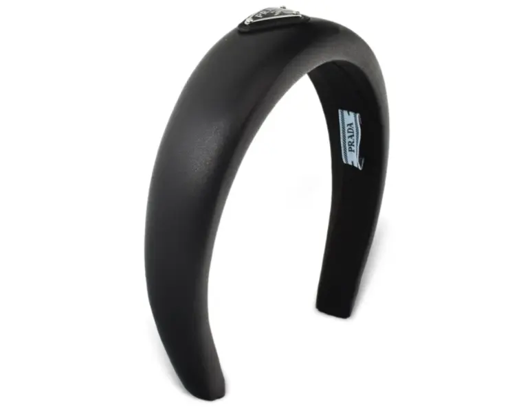 Headband Prada ini terbuat dari bahan kulit dengan desain sederhana dan bentuk yang rapi. Ciri khasnya terlihat pada detail logo segitiga Prada di bagian depan yang menjadi identitas merek tersebut. Desainnya yang bersih membuat aksesori ini mudah dipadukan dengan berbagai model rambut, mulai dari rambut pendek hingga rambut panjang yang ditata sederhana.